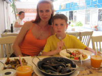 Отдыхают очень много греков, очень много сербов (машины на парковке стоят), есть болгары, украинцы... Тагила там нет! Общаться с персоналом приходилось на ломаном английском (благо, греки его знают также плохо), в ресторане русскоговорящих официантов было всего 2 из 10. В магазинах мы и на пальцах объяснялись, но кое-как справлялись. Английский за 12 дней я неплохо подтянула (когда познакомилась с греками, вот тут уж приходилось стараться на английском обеим сторонам :) Это не арабские страны, тут я ощутила "языковую беспомощность" острее, чем там.