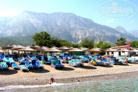 Вот так сидишь в баре, смотришь на горы и облака над ними и понимаешь, жизнь прекрасна... Море - рядом. Но заходить туда можно только в специальной обуви, иначе можно изранить все ноги. Пляж из мелкой гальки. а в море - валуны. Даже на глубине, если заходить с пирса, можно легко удариться о возвышающийся валун. Мы так разбивали себе коленки и руки. Причем на валунах какие-то острые наросты, так что ранишься до крови. Кто плавал на большой глубине - не сильно от этого страдал, но мы с ребенком помучились, теперь будем искать только песчаные пляжи.