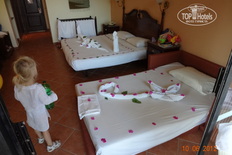 По обслуживанию и персоналу: хамы в принципе ВСЕ)). Есть хамы скрытые – уборщики, хамы смелые – бакалейщики и хамы бубнящие – официанты и повара)))))). Стоят, смотрят на тебя, и бормочут на своем что-то, достаточно злобно))))))). Уборщики, к тому, что они хамы, ещё и плохо убирающиеся (но опять же, как и везде – ничего нового). По приезду номер помыла сама, т.к. малышня с радостью кинулась из всех углов лопать пыль и всякие разные соринки, а потом он убирался под присмотром супруга – достаточно хорошо, но очень тяжело вздыхая))))))))))), за что получил чаевые и потопал дальше. Один раз шикарно украсил кроватки – дети были в восторге. Всё злобное бормотание со временем пропадает (видно присматриваются) или, в чём почти на 100% уверена, играют роль купленные платные коктейли (3 дол штука – так себе кстати), ужины (10-20 дол), и большую роль играла старшая дочка, которая умеет здороваться и говорить спасибо на их языке (таяли при этом даже самые мерзкие рожи)))))))))))))))).