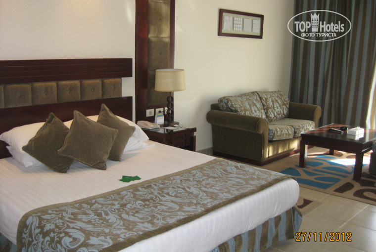 Начну по порядку. Отдыхали с 27 ноября по 4декабря.Летели из Домодедово от компании ТУИ.Туда долетели хорошо,без нареканий,пограничный контроль прошли быстро.Из москвы улетали в 9-30, поэтому к обеду были в отеле.Отель даже при подъезде к нему выделяется своей роскошью.В дверях встретила милая девушка Евгения,любезно пригласила присесть на диван и помогла заполнить бланк на вселение в отель. Тут же принесли приветственный чай каркаде.Добавлю,что перед отъездом заполнила бланк на участие в акции,Я ЕДУ, размещенной на сайте отеля .По этой акции наш стандартный номер увеличили на ДЕЛЮКС и в номер принесли блюдо с фруктами и бутылку вина.