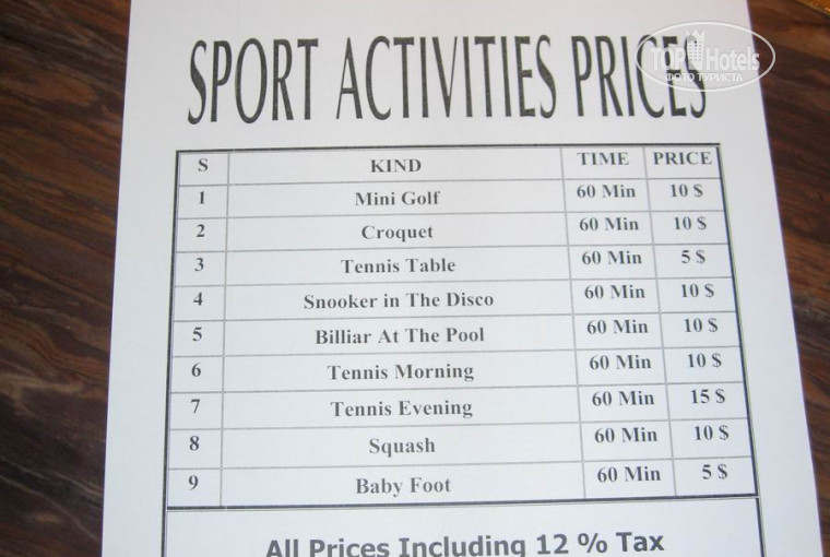 1 К сожалению, весь спорт в отеле платный – от настольного тенниса, бильярда 10$, до аренды теннисного корта 10-15$. {хотя на сайте нашего туроператора Пегаса они все значатся как бесплатные http://agency.pegast.ru/top/egypt/nhotels?id=70- и мы звонили в Пегас перед отъездом и после – они утверждают, что все должно быть бесплатно, такие данные им дает отель), даже несмотря на то, что у нас были белые браслеты (все включено). Мы подходили на ресепшен и на пляж – и везде требовали оплатить. Причем система оплаты очень не продумана. Если вы хотите поиграть в большой теннис (а теннисный корт был расположен рядом с нашим номером), то сначала надо идти через весь отель на ресепшен, заплатить, потом идти через весь отель на пляж, взять там ракетки и мячи и обратно на корт. Причем не факт, что в 7 утра на пляже кто-то будет – а это самое удачное время для игры, пока не жарко.В итоге кроме нас в теннис никто не играл, а в бильярд играли один раз, и когда мы к ним подошли, они сказали что им все дали бесплатно. Когда на следующий день мы пошли на ресепшен за бильярдом, там сказали что все платно. Отмечу, что в Египте очень много отелей с бесплатным теннисным кортом в дневное время. В результате мы просто приходили на корт в 7 утра и играли там минут 30-40.