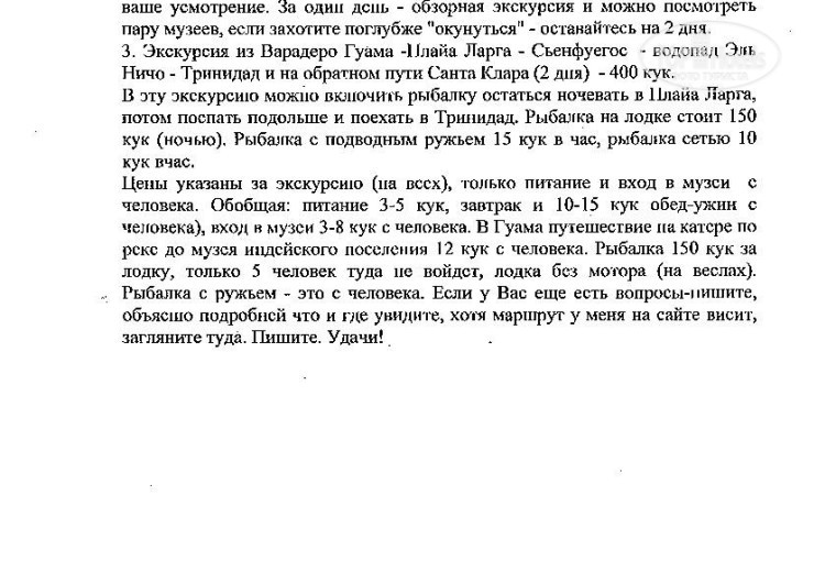 Пляж довольно симпатичный, залив обалденный. На пляже есть бесплатные каяки, катамараны, яхты. Нам понравилось , мы плавали.Еще есть возможность поиграть в настольный теннис, бадминтон, бильярд, но оборудование старое. Зато у бассейна есть джакузи на 7 чел и мы там часто зависали. На экскурсии ездили в Гавану с частным гидом (Эрнесто и Изабель см. приложения), на О. Кайо-Ларго и в дельфинарий с Пегасом. На остров записывайтесь сразу по приезду, очень здорово. Места остается мало, если есть вопросы-пишите, отвечу. Удачной поездки! Приложения лучше распечатать для чтения.