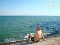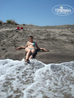 На территории отеля берег состоит из бетонных блоков и купаться в море там нельзя. Надо идти на городские пляжи. До ближайшего из них надо идти минут 15. Народу там очень много, но несмотря на это там чисто. Обязательно есть спасатели, множество покатальных услуг, продавцы мороженного, пирожков, кукурузы и прочих баров и ресторанов. Для нас это всё очень шумно, поэтому мы шли пешком километра три на чёрный дикий пляж, где народу намного меньше и вода чище. Чёрный песок, надо отметить, очень горячий! Если 3 километра для вас много, то из центра Поморья специальные таксисты отвозили на чёрный пляж за 2 лева (~1 евро). В 2010 году.