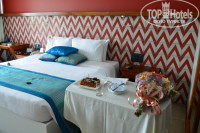 Номер у нас был на третьем(последнем) этаже с видом на океан. Номер - средних размеров, мебель не новая, простая, но в хорошем состоянии, ТВ- плазма, русских каналов не было, но у нас с собой была флешка с фильмами - так что по вечерам было что делать ( флешку подключали к ТВ). Ванная комната была разделена на три отдельных сектора: умывальник, туалет и душевая. Кстати была у нас "изюминка" в номере - это еще и ванная на балконе))). Кондиционер в комнате индивидуальный, сейф и холодильник имеется.