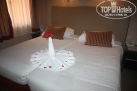 3. Номера уютные (LCD ТВ, чайник, минибар, чипсы орешки в номере(платно) , с высокими кроватями, удобными матрасами и невероятно мягкими подушками. Спать на таких кроватях было одно удовольствие, утром невозможно оторваться от кровати. Шампуни берите с собой, кроме мыла ничего нет. Отдельно стоит упомянуть про свет, его просто НЕТ, кроме двух ночников над кроватью и настольной лампы. Уборка номеров вовремя, все чисто, каждый день новая скульптура из полотенец и лепестков роз.