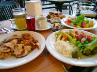 По приезду сразу направили питаться. Шведский стол. Все аккуратно, вкусно, красиво... как итог - мы обожрались. Ну и еще пару дней наращивали количество потребляемой пищи. Потом наступил некий предел и мы таки перестали съедать количество еды превышающее собственный вес. Так, напишу, что было вкусно мне: рыба жареная, куренок с дымкомс, нагетсы, тушеные овощи, сыр, из десертов ПАХЛАВА... я вообще ее фанат. Вино не понравилось. Коктейли цветные и весьма токсичные. Напиваться там не особо захотелось, слишком све культурно... правда, когда народу прибыло культурности поубавилось. Индейка периодически была жестковата. Мнение моей подруги: салат с тунцом был вкусен и вообще все закуски с этим видом живности, рис вкусен, яичница на завтрак, блины, йогурт, который без ничего, овощи, десерты обалденны... и вообще кормежка от пуза.