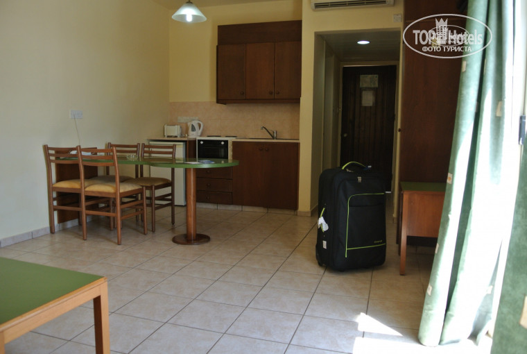 Ежедневные прогулки на лучшие пляжи Айя Напы не напрягают, живописная пешеходная дорожка идет вдоль кромки моря. Ближайший пляж(не лучший, но без толп отдыхающих) в 10 минутах. Зонтик +2 лежака = 7.5 евро. Можно вернуться обедать в номер, кухонный уголок полностью оборудован. Двухкомнатные апартаменты "1 BEDROOM" с отдельной спальней более комфортные - не слышно работающего холодильника.