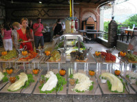 Мясо всегда какое-нибудь, один раз язык говяжий был. Раза три была форель, всё остальное время тоже какая-то рыба. Курица в разных видах, крылышки, типа нагетсов чегой-то было. Овощей полно. Много куда кладут перец, так что остренького хватает. Про питье я писал. Помимо алкашных напитков, очень неплохой кофе в машине, турецкий чай в чайнике (только на завтрак), в остальное время чай из пакетиков. Вода, соки юпи. Свежевыжатые за денежки. Газировки фанты, спрайты, колы.