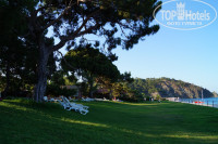 Территория очень ухоженная, везде цветы, стриженые газоны, пальмы, сосны. Все довольно красиво. Всю территорию можно обойти за пару минут, все компактно, но в то же время все есть - бар у бассейна, кальянный бар от него неподалеку, на газоне какие-то тренажеры, гамаков не заметил, как на предыдущих фотках, амфитеатр, детская площадка, вдалеке за амфитеатром на улице под крышей - аля-карте ресторан . На 97% соответствует действительности. Бассейн достаточно большой, примерно половина его составляет глубина 2м, остальное - 1,5м. Странным показалось что детские горки выходят на глубину 2м. Есть еще одна мизерная горка с выходом на детский "лягушатник". Есть еще одна большая горка.