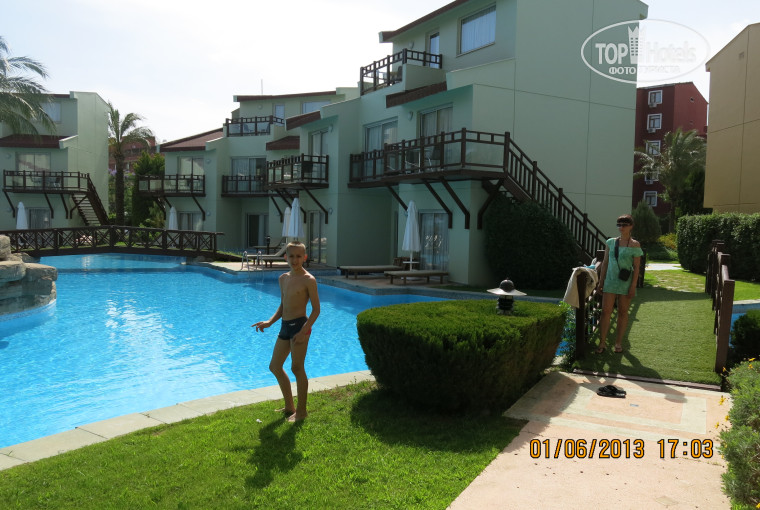 Перед главным корпусом 3 бассейна - большой для взрослых, средний с тремя небольшими горками для детей 5-8 лет и маленький(не по размеру, а по глубине) для малышей с тремя маленькими горками- там с ними и родители и аниматоры, а рядом детский клуб. У бассейна бар и там же можно перекусить. С 13 до 16-00 здесь дают неплохие гамбургеры. Пиво советую брать в банках в баре под амфитеатром(очень быстро заканчивалось). Территория у бассейна да и вообще везде очень чистая и ухоженная. Тут, у бассейна, нам недостатком показалась очень однообразная и неинтересная анимация. К тому же в отеле, где 80% русскоговорящих туристов, большим недостатком считаю отсутствие русской музыки и русскоговорящих аниматоров(на конкурсах объяснялись почти на пальцах). Вечером в амфитеатре выступали неплохие танцевальные коллективы, но хотелось пойти в соседнюю Сельгу Бич, т. к. от туда всегда звучала русская музыка и перекрикивала нашу. Русской музыки не слышали на территории отеля вообще! Может быть администраторы отеля примут во внимание данную проблему....