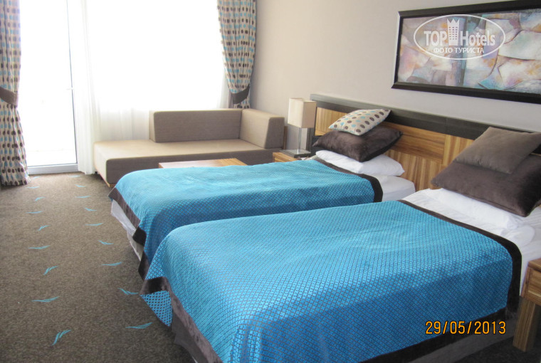Приятно провели отдых в отеле Rixos Lares с 29.05 по 05.06.2013. Проживали в номере стандарт sea view. Приехали в гостиницу рано около 8 утра. Ехать от аэропорта минут 20-25. Заселились в номер около 11.30, до этого времени успели позавтракать , ознакомиться с отелем. Отделка и состояние мебели в отели на очень приличном уровне, уютно. Номер не маленький, большой балкон. В номере жк телевизор, муз. центр, душев. кабина, сантехника новая, шампуни, гели, лосьоны в маленьких бутылочках пополнялись регулярно. В номере убирались регулярно, если весела табличка не беспокоить, убирались позже. Мини-бар пополняли регулярно, мин. вода, кола, фанта, спрайт, пиво баночное effes, вода. Вообще в отеле поддерживается чистота на должен уровне, что очень порадовало. Питание достаточно разнообразное рыба и мясо в разных видах, овощи много фруктов, были и дыни и арбузы, черешня, персики. Напитки приносят официанты, очень понравился их профессионализм, уже на второй день запомнили какие напитки приносить, работают очень быстро. Мест в ресторане всегда было достаточно. А-ля карт рестораны не посещали. Алкоголь не употребляли , кроме пива ....пиво хорошего качества. На самом нижнем этаже рядом со спорт залом и спа-центром есть витамин бар, где свежевыжатые соки апельсин, грейпфрут, всегда в любом количестве бесплатно. Спортивный зал состоит из двух помещений в одном беговые тренажеры и вело в другом различные тренажеры и штанги. Анимация в отеле на хорошем уровне, с утра можно проехаться на горном велосипеде, на пляже дважды в день волейбол, и множество др. по программе. На пляже своя сцена, где проводятся пенные дискотеки.