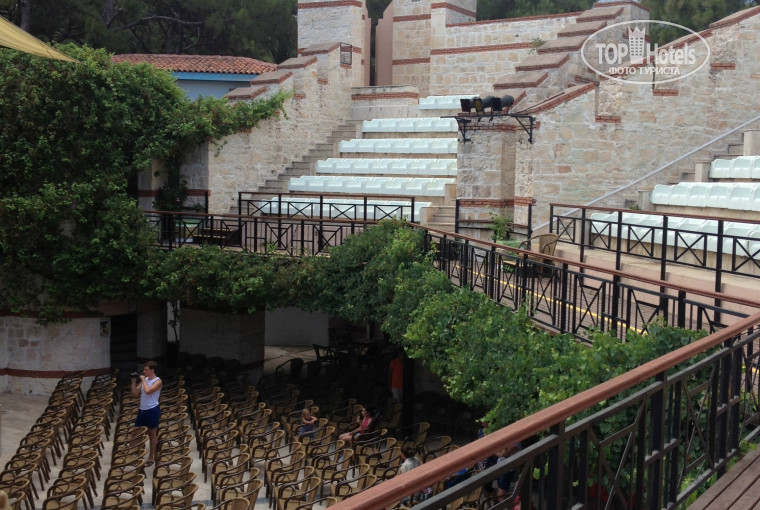 Отель просто картинка) в живую все намного красивее фотографий, все в соснах, корпуса обвиты плющом, везде цветы, территория разбита на улочки разного цвета, что бы удобнее ориентироваться, все очень чистенько, есть несколько кафе, куда можно зайти в любое время выпить кофе, чай, на территории работает бесплатный wi-fi, интернет работает нормально, единственное, соединение периодически выключается и нужно перенабирать пароль, но это не сложно). На территории отеля есть несколько магазинчиков, где все необходимое можно купить, да, цены приличные, но если что-то нужно сейчас, то очень удобно, а так можно выйти из отеля, пройти минут 10 и есть ряды торговые и палатки с фруктами, покупали там черешню -4$ кг.