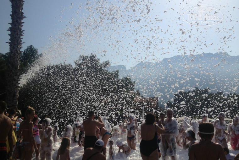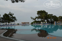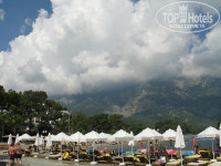 4) Отель достаточно удален от дороги и остальных отелей - в некоей резервации. Это минус, если вы привыкли делать вечерний променад после ужина по туристическим улочкам городка с их магазинчиками. Мы за черешней и клубникой ходили пешком в Гайнюк около 2-3 км в одну сторону. По берегу тоже особо не погуляешь как в Белеке. Охранник караулил у входа на нашу территорию пляжа и разворачивал туристов, который пытались пройти дальше по пляжу. Но в действительности пляжи закнчивались и начиналась территория отеля с монолитным пирсом, где иногда устраивали вечернее шоу на полуострове.
