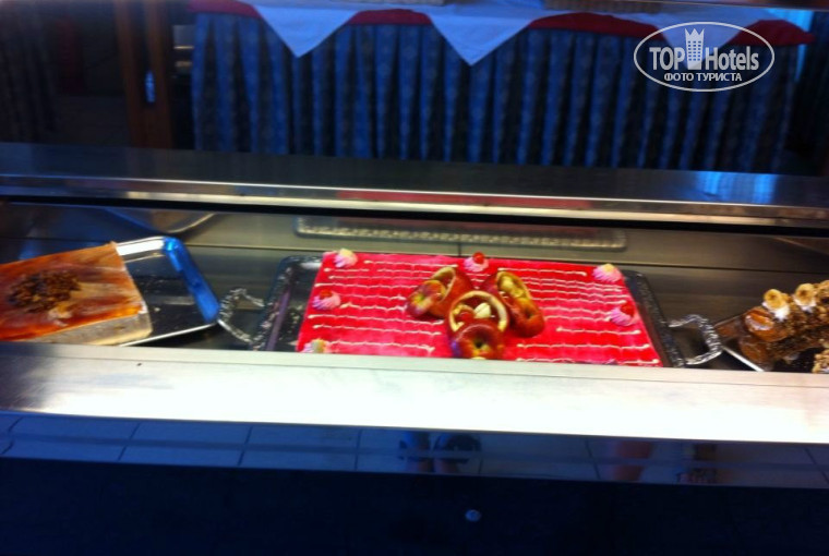ЕДА: кормили неплохо,на завтрак обычно было 6 видов разных паст,4 вида хлопьев,яйца,можно было себя хлеб поджарить,немного пироженных,каш я не видела. На обед супа не было обычно были макароны,картошка,картошка фри,мясо разное,овощи,салаты и оставшиеся пироженные с вчерашнего ужина.На ужин давали суп(он был не вкусный),картошка,картошка фри,макарона,осьминог,овощи, конечно же,салаты,для сладкоежек там рай,каждый вечер был большой торт и лдва маленьких,часто было желе,и пироженные,арбузы,дыни,ананасы тоже присутсвовали)Кушать можно было в ресторане и в таверне,но в ресторане больше выбор,а в таверне иногда что-нибудь на костре жарили.Напитков разных достаточно,но коктейли платные.