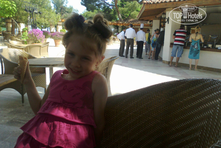 Отель понравился, все как на картинке, правда аниматоры немного не по мне (шуток я их не понимала), но всем остальным (моей семье и мои родителям понравились аниматоры), питание хорошее, мороженым только объедаться, выпивки много и вкусно)) еда хорошая, каждый день был тематический ужин, например европейской кухни, турецкой, восточной, рыбный день и ...вечером развлечения тоже разные когда был дождик, развлечения переносились в отель и не отменялись)) очень было интересно для деток, с ними постоянно играли аниматоры и была супер детская комната со всякими лабиринтами и детская площадка на улице с машинками, качелей и горками и дискотека вечером для детей, на которой аниматоры учили деток танцевать за 3 дня детки знали все движения в танце и выполняли все симметрично, очень красиво)