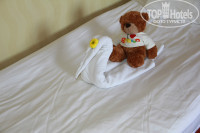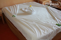 Номер стандарт. Одна одно- и двухспальная кровати, и диванчик. Пол- ковровое покрытие. В номере кондиционер, фен, сейф, телевизор- все работало исправно. Уборка в нашем номере осуществлялась только два раза за 10 дней прибывания. Наш номера находился в самом конце коридора и горничная доходила до нас только к двум-трем часам. А у нас в это время ребенок спал.