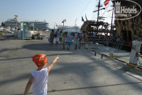 Брали тур на Пиратский корабль – Развлекуха для детей, аниматоры не уставали бегать, искать клад, развлекать детей… Высадка на острове – с поиском клада, пенная дискотека в завершении – супер мероприятие! Но взрослых «разводят» на деньги за пиратские атрибуты для детей, цены на игрушки от 10$, будьте готовы к тратам, дети иначе вас затюкают! И еще развод на фотографии, одна рамка с фото – 35$! Я договаривалась с турком, который сидел и печатал фотки за компом, он мне на карту памяти 29 фоток скинул, и две фоторамки + альбом сделал за 70$. Секрет третий – торгуйтесь по фоткам, возьмите флешку, пригодится… Покупайте не у того кто громко кричит, а у того, кто тихо сидит и печатает… т. е. «слева»)))