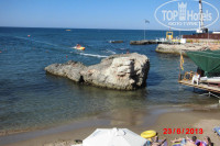 Пляж 50 м от отеля.Мелкая галька,лежаки.Если пройти пешком минут 20 от отеля влево,то попадете на пляж Стар бич.Песочный пляж,там есть и развлечения.