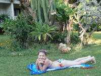 После завтрака, мы переодевшись, пошли на пляж, попутно оценивая территорию отеля. Пальмы, цветы, газоны, выложенные плиткой дорожки, лестницы. бар, бассеин - создали положительные впечатления, а звуки которые издают (если не ошибаюсь) цикаты- живущие на деревьях насекомые, придали свой шарм. К сожалению мы так и не смогли их увидеть.