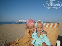 Пляж: песчано-галечный, первые несколько дней были волны, даже в 7 утра, когда обычно море самое спокойное, дочка из-за этого не могла заходить в море сама, даже в круге, под конец отдыха море было поспокойнее до обеда особенно. Заход-галька, достаточно быстро глубоко. Многие пользовались спец обувью, но мы заходили спокойно, даже сын, которому 1год заходил босиком, снимал шлёпки и бегал по пляжу, вот это массаж))) Море очень тёплое и чистое. Рядом с пляжем в море впадает река, иногда днем чувствовались слои холодной воды из реки. Песок на пляже мне лично больше напоминал пыль, как строительный, я такого никогда раньше не видела, дети постоянно чумазые, не только мои, все абсолютно))) Если у Вас есть белый купальник не берите его сюда, у меня тоже был, до первого и единственного раза, когда я его надела на пляж((( На пляже людей немного, всегда есть свободные шезлонги в любое время, а около бассейна аншлаг. В детском бассейне почему-то всегда холодная вода, но много детей там купалось, мы предпочитали море.