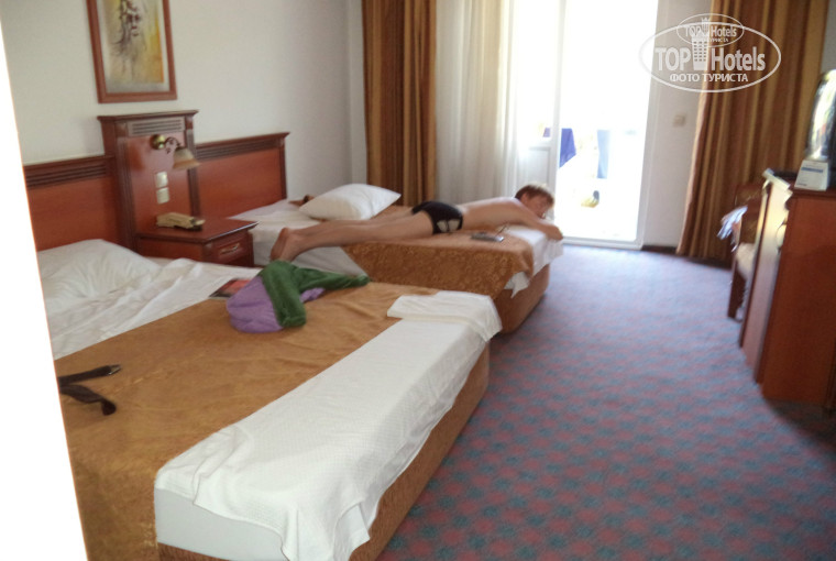 Заселение прошло быстро, может быть потому-что прибыли мы в 16 часов. Девушки на рессепшене не особо приветливые, лишний раз боишься у них что-то спросить, хотя наверное они устали всем улыбаться, все-таки приехали мы в самый сезон. За номер ничего не платили. Взяли сейф за 2 доллара вдень + залог 10 долларов (его вернут). Можно ещё взять пляжные полотенца под залог 10 долларов (его тоже вернут). Номер был на 4 этаже, хотя на первый взгляд, показалось, что это 1 этаж, окна выходили на дорогу, поверьте - это не минус, а плюс, потому-что на той стороне, что выходила на море, было очень шумно. Нам попался семейный номер - одна двуспальная кровать и вторая немного поменьше. Номер чистый (не скажу, что уютный, но жить можно), всё исправно работало, ничего не ломалось, не протекало. Кондиционер регулируется пультом под себя, это конечно плюс, так как слышала, что в некоторых отелях кондиционеры включаются по расписанию. Вода в кране текла как ей самой вздумается, то прохладная, то горячая, чаще всего прохладная. Убирать в номере приходили каждый день, но мы особо и не мусорили, постель не загрязняли, поэтому особо не замечали, поменяли ли нам её, или просто перестелили. Полотенца зато приносили каждый день новый комплект, а старые не забирали. Через пару дней пришлось просить, что бы полотенца забрали, а то у нас целый склад образовался. Белье видно, что не одну сотню раз стиралось. Но мы не привередливые. Воду и туалетную бумагу оставляли каждый день. В ванной только жидкое мыло, так что не смотрите на 5*, берите с собой мыльные принадлежности. wi-vi есть только на рессепшене.