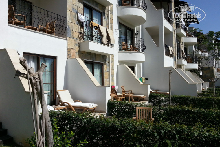 4. Размещение. Мы жили в первом аннексе. Приехали в районе 11, но нам сказали, что пока готовых номеров нет, в течение часа будут. За это время мы прошлись по территории, я увидела аннекс, вернулась на ресепшн и спросила, нельзя ли нас поселить туда. Девочки сказали, что там вообще номеров нет, но передали просьбу управляющему, который подошел ко мне и сказал, что сегодня в 12 один номер освободится и нас до 14.00 туда заселят. Я, если честно, испугалась, что сделала неправильный выбор, да и с ребенком устали. Но мы не прогадали. Номер оказался большим, первый этаж, отдельный вход, вместо балкона терраса с 2 лежаками + 2 стула+столик и огороженная кустарником лужайка. Балконная дверь еще имела дублер в виде сетки, так что о насекомых мы не переживали совсем. И я ничего и никому не доплачивала, просто вежливо спросила. Для примера размещаю фото балкончиков в основном корпусе, где еле умещаются 2 стульчика. Как оказалось, вообще в аннексах только family rooms, причем первый корпус гораздо удачнее второго, непосредственно примыкающего к детскому клубу (я бы отказалась там жить). В ванной душевая кабина, гели, шампунь, бальзам для тела.