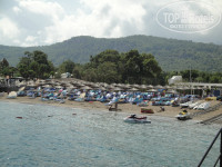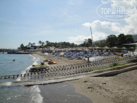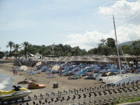 6. ПЛЯЖ - две малюсенькие наклонные площадочки между тремя пирсами с насыпным песком. Вход в море - как и везде в Кемере - полоса валунов. У среднего пирса расчищена небольшая дорожка, там один песок по дну. На одной площадочке пляжа лежаки всего в два ряда, на другой - в четыре-пять.
