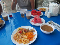 Еда-это тоже отдельная тема... На завтрак было самое сьедобное блюдо-вареное яйцо...Никаких каш и омлета как я ожидала после болгарской тройки я не увидела... Чай и кофе наливали в пластиковые стаканы..Столы пластмассовые и стулья тоже...Столы сметались метелкой ,не вытирались... На обед и ужин почти одно и то же...Суп-пюре -макарон или рис и соевое мясо ,курица редко...Рыба с душком была один раз...Пол отеля отравилось и назавтра все ходили и спрашивали смекту... Я пролежала целый день в постели-рвота и понос,не могла ничего есть..Подумала-слава богу ,что не взяла с собой 6 лет внучку-что бы ребенок тут ел...Правда из фруктов были арбузы очень невкусные