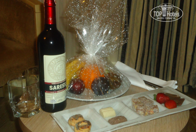 На третий день нашего отдыха нам в номер принесли презент от отеля: бутылку красного вина, тарелку с фруктами и сладости. Было очень приятно за такое внимание.