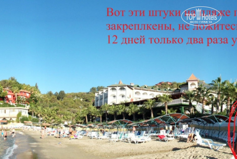 Летали с мужем и ребенком 5 лет с 06.09.13-18.09.13.Поехали в Турцию изза того что в Египте произошло, меняли белеты. Два года назад отдыхали в Египте, намного качественнее обслуживание. Номер у нас был очень большой и с видом на море. В номере убирали каждый день. оставляли бутылку 1,5 воды.В отеле было очень много народу, и видимо турки уже заелись, и переходят в обслуживании на массовость а не на качество. Море отличное. Правда весь пляж грязный, в окурках, очень редко видели что убирают там. На пляже тенты металлические падали от ветра (фото прикладываю.), с детьми под них ложиться не советую. Так что мы уходили подальше от них на другую часть пляжа. Море было наиюолее спокойное до 15 сентября, потом начались ураганные ветры. мы с семьей воспользовались ситуацией и поехали в последний день в Аланью. Вышли на остановку и подождали автобус, они там часто ходят. Приехали на конечную улицу к базару. купили в магазинчике карту и пошли гулять. Из достапримечательностей у них есть замок у моря, пещера. Вообщем здорово погуляли, там по улицам очень большое количество туристов ходит, особенно иностранцы. Больше сюда уже не поеду, хотя впечатление осталось вроде не совсем уж плохое. наверное отдыхать всегда хорошо.)