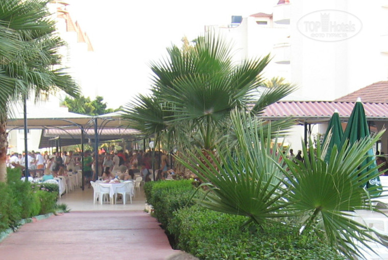 Отдыхала в этом отеле в августе 2006г. с ребенком. Отель нам предложили в турагенстве, рекомендовали как хорошую трешку на первой линии. Действительно, отель не плохой в своей категории, минимум всего в нем присутствует, есть даже водная горка (большая и для малышей), тогда была одна, может сейчас есть еще - не знаю, детский клуб, где днем можно оставить ребенка поиграть, детская площадка, вечерние представления и дискотека для детей. Единственный минус - территория, отель вытянутый, и территория состоит из дорожки и корпусов вдоль нее, влево и вправо пойти не куда. Если живете в дальних корпусах рядом будет бассейн с горками, но до моря придется пройтись, если в ближних корпусах к ресепшен, то море будет ближе, но в целом - не принципиально где жить. Столовка (рестораном назвать трудно) и основной бассейн находятся по середине, от всех корпусов приблизительно одинаково.