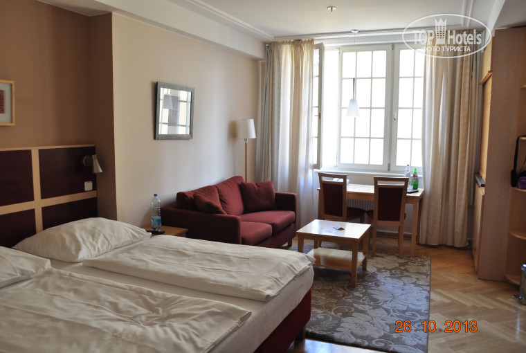 Останавливались с мужем в этом отеле в конце октября.В Праге впервые,поэтому немного беспокоились,что долго плутать будем.Но расположение отеля просто замечательное,захочешь-не заблудишься.Действительно всё рядом,всё что хотят увидеть туристы в центре.Жили на 7 этаже,повезло,что окна во двор выходили,так что шум улицы не слышали.Номер очень уютный,классическая мебель.Убирались замечательно,полотенца белоснежные,халаты тапочки и полный набор в ванной:шампунь,лосьон для тела,шапочка,даже ватные диски с палочками,мыло,а вот геля для душа не было.Но это не смертельно.Завтраки нормальные,мы наедались.На рессепшене хороший,грамотный персонал,по-русски говорили и помогали,если нужно.Кровать большая и удобная...)))Вообщем остались довольны и отелем и конечно в восторге от Праги.