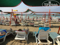 Дорогу переходите по подземному переходу, все чисто, выложено плиткой. На пляже есть туалет, душ (полноценный и для ног), на пляже песок, лежаки под тентами. Есть бар, в котором днем можно подкрепиться, он работает с 11 или с 10.