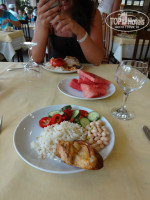 Ресторан поделен на две равные части - места на улице и непосредственно в помещении. В помещении кондиционер и еда, на улице второй бар, только там можно взять напитки. К этому бару всегда очередь и он работает только во время обеда, ужина. Мы сидели внутри, там прохладно и еда близко)) Бывало, что не хватало ложек, вилок. Радовало, что на обед и ужин ставили красивые круглые бокалы на тонкой ножке и бутылку холодной воды без газа.