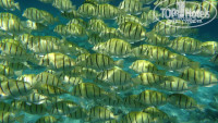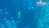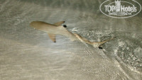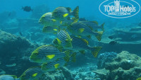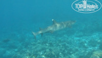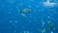 А вот риф немного разочаровал. Нет, рыб там полно и они крупнее, чем на других островах, но судя по отзывам, ожидали большего. Я думал, что акул придется руками раздвигать а на деле на весь риф всего несколько крупных белоперых, держатся на глубине, на отмель выходят ближе к вечеру когда волны, вода мутная и освещение плохое, даже не удалось их нормально пофоткать. Да и сам риф некрасивый. Ну есть метрах на 8 подводные гроты, и ничего интересного в них нет. Но одно место на рифе просто завораживает. Рыбы там собираются несметными косяками и стоят неподвижно на слабом течении, окружают тебя со всех сторон и кажется, что ты попал в рыбный суп.