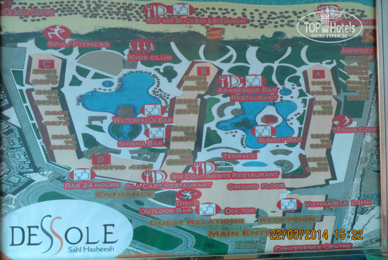 Прочитали много противоречивых отзывов, но тем немение поехали в этот отель. Просто решил поделиться своим свежим мнением. отдыхали с 14го по 26е марта 2014. с приятелем. в Египте были более 15 раз, в сетях дессоле в третий, в этом отеле в первый раз. Есть с чем сравнить. Да, в отеле практически одни русскоговорящие туристы, но при этом мы не испытывали никакого дискомфорта,все очень вежливые люди. совсем пьяных неадекватных нет. территория большая, персонал вежливый и в основном понимает по русски, все регулярно убирается. Всегда есть места на пляже и у бассейнов, в барах нет очередей, питание стандартное для египетских 5* отелей + лоунж ресторан в 4 корпусе, где всегда есть вкусный овощной супчик и обслуживают официанты. + 6 баров а ля карт + рыбный ресторан за 15 долларов (рекомендую, даже после тайланда. там еще шоу устраивают.) Небольшой минус, это заход в море. Не всем без коралловых тапочек это будет комфортно. И рифа своего нет, так что за рыбками - на экскурсию. Анимация на уровне, скучно не будет. Вечером дискотека, живая музыка с 21.00 до 00.00, потом дискобар с 00.00 до 03.00. Номера стандартные, мебель старовата, но все исправно работает. Хороший отель за свои деньги. Поеду еще раз в октябре. Людям, сетующим на однообразное питание )) хочу заметить , что мы за 2 недели ни разу не отравились ни алкоголем, ни питанием. что не маловажно.