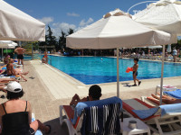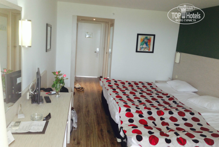 Отдыхали втроем семьей (дочке 9 лет) с 25 апреля по 6 мая. Дорога из аэропорта до отеля заняла 1час 40 минут, в 4:40 утра мы уже стояли на ресепшене. Встретили нас приветливо, предложили позавтракать (мы отказались, хотелось спать), обраслетили и проводили в номер. Номер 353, вполне приличный, чистый. Дочь отказалась спать на диване, ей тут же принесли евро-раскладушку. Уже проснувшись узнали, что у нас вид на пустырь с речкой, справа море, внизу гриль-кухня открытого ресторана. Напряглись. Решили пока осмотреться, что бы определиться с заменой номера. Вечером нашли для себя некоторые плюсы в расположении номера, переезжать уже не хотелось. От дыма гриля при соответствующем ветре, блеяния баранов идущих в 7 утра на выпас, вечернего кваканья лягушек на речке прекрасно спасает балконная дверь и отлично работающий кондиционер. Номер ориентирован четко на восток, т.е. солнце встает прямо в окно. До завтрака все развешанные на балконе вещи и полотенца успевают хорошо высохнуть, потом солнце постепенно уходит, и в течении дня в номере совершенно нормально и без кондиционера. Выглянув с балкона, заранее знаешь, что будет на обед или ужин на гриле. Достаточно тихая сторона; вид на море, он же на бассейн сопровождается шумом от отдыхающих; самая шумная сторона - с видом на соседний отель, чья анимация и дискотеки громкие и продолжительные. Еще у нас в номере брал Wi-Fi. Безалкогольный бар в номере пополняли дважды (минералка, фанта, кола, сок). По работе горничной вопросов нет, 5+. Уборка ежедневная, ежедневная замена полотенец , тех, что оставишь на полу ванной. Мне показалось, что постель меняли через день. «Контрольного» мусора не оставляли, оставляли чаевые: чередовали через день 1$ и шоколадку Аленка 60г. Полотенца не новые, чистые и целые, постель выглядела более выгодно. Из номера ничего не пропало. Сейф не брали. Один раз забыла сумку в ресторане. Обнаружила ее на ресепшене в целости и сохранности. Обедать и ужинать старались в ресторане за одним и тем же столом на улице. Основные официанты Муритен и Кадир всегда приветливые, крутились как пчелки, не отлынивали. Иногда официанты били посуду, чтобы развеселить отдыхающих. В плохую погоду бывает трудно найти столик. Освободившиеся столы убирают не всегда сразу, испачканные скатерти меняют, а чистые просто переворачивают другой стороной.