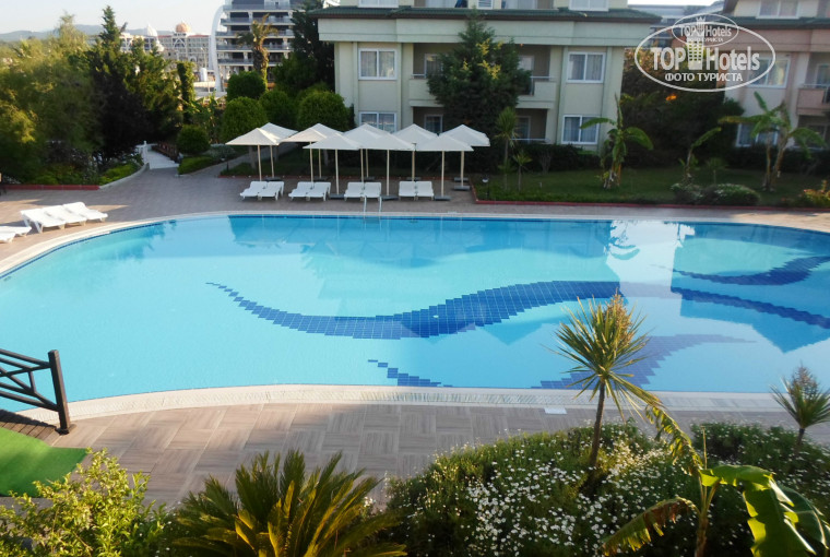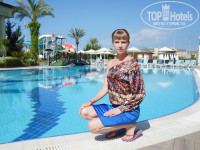 Отдыхали в мае с друзьями, нас было 10 взрослых и двое детей 10лет и 12лет. Нашу семью разместили в вилле на втором этаже, мы были очень довольны, просторно, 2 комнаты из обоих выход на балкон, красивый вид из окна, вокруг бассейны. В каждой комнате и даже в ванной , можно созваниваться между номерами наша компания большая была так что мы активно пользовались. Номер убирали каждый день и не только номер, ночью по всей территории мыли дорожки, все убирали, чистили. Возле нашей виллы был аква-бар, работал до 23-00, муж был этим доволен, напитки разнообразные: от детских молочных коктейлей до крепких напитков, мужчины пробовали водку, но в основном пиво(оно слабо алкогольное). Питание хорошее, мясо курицы, индейка, рыба, баранина шашлык, был борщ, солянка, лапша, салаты, сладости, фрукты - всего не перепробуешь. Кормят не только в ресторане, но и у бассейна и на пляже. Пляж рядом, море чистое, пешком прогулялись до дельфинария (15мин.). Территория небольшая, но достаточно. Везде густая зелень и цветы. Море прохладное, но все равно купались.Мы отдыхали в Турции первый раз и нам очень понравилось.
