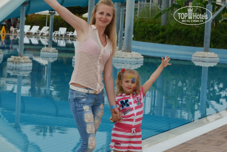 Отдыхали с 24 мая по 7 июня 2014 г. с детьми 1,5 и 5 лет. Стандартный номер удачно разделен на 2 зоны (для детей и взрослых) и легко вместил 4 человека. Отель был заполнен полностью, но его огромная территория совершенно не сковывала и не давала чувствовать себя как в муравейнике. Сама территория очень зеленая и уютная. Множество бассейнов позволяло всегда найти местечко под солнцем возле воды. По утрам рекомендую ходить на пляж к морю (пока не так жарко), но следует не затягивать по времени, т.к. количество лежаков возле моря ограниченно и после 10 можно не найти места с лежаком. Сам пляж галечно-каменистый и без обуви в воду входить проблемамично. Также он находится поодаль от корпусов и бегать с детьми к туалетам долековато. На пляже нет бара, но можно приносить с ресторанов и баров (которых на территории достаточно). Сам пляж убирается редко и плохо - везде валяются окурки, бутылки от воды, посуда.