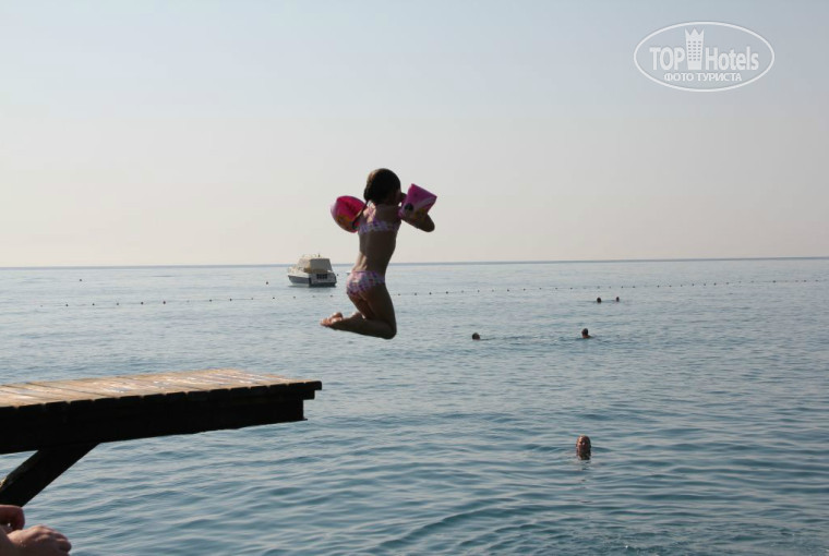 Отдыхали в этом отеле с 27 августа по 8 сентября 2013. Мы с мужем и двое детей 5 и 1,5 года. Нам все очень понравилось!! Заселили без проблем, пришлось только подождать до 12, но номер хороший, на 3 этаже. Убирали каждый день, тщательно. Территория очень ухоженная. Берег каменистый, но если купить тапочки, входишь вообще без проблем.Лежаков достаточно.На берегу пирс с вышкой, мой муж с ребенком оттуда не вылезали. Есть детская площадка с горкой и качелей. Анимации достаточно. Дочка ходила в детский клуб только последние несколько дней, до этого хватало просто моря )) По вечерам песни, детская дискотека. Кормят хорошо. Мы всегда были сытые. Младшему ребенку многое привозила из дома (мясо в баночках, каши) но часто кормила местным. Давали овощные супчики, кашки. Но не в обязаловку.. Поэтому ели и свое. В принципе там есть супермаркеты, где можно купить и пюрешки и кашки для детей. Со старшей дочкой проблем не было. всегда была сытая. Пару раз ездили на экскурсии в аквапарк и рыбалку. Вечерами гуляли по улице. Отдыхом довольны! Обязательно поедем еще!