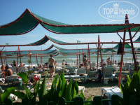 Пляж через тонель под дорогой, идти совсем близко. Пляж хороший, чистый. Крупная галька, а как в море заходишь - песок. Вход ровный. Развлечений хватает на пляже, кроме аэробики в море, и игр. Для деток есть горка, качели. В обед мороженое... надо постоять очередь за ним)))