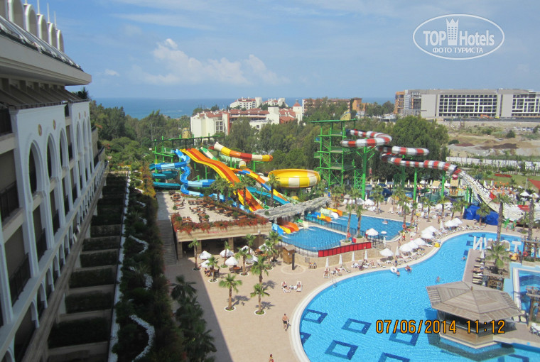 В отель прибыли около 18.00, от аэропорта ехали около часа с учетом заезда в три отеля. Разместили сразу, в паспорт положила 20$ для подстраховки-номер 5049-отличный (5й этаж, почти середина, вид на море и на всю внутреннюю территорию отеля, т.е. все бассейны, аквапарк и т.д.), но номера там все хорошие и вид везде приличный по моим наблюдениям, но все же лучше середина и левая часть, которая граничит с "КРИСТАЛ САНРАЙЗ КВИН".