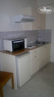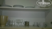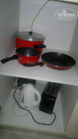 на кухне есть абсолютно вся посуда: сковородка, две кастрюли, тарелки, вилки, ножи, ложки, бокалы. Есть холодильник, чайник, тостер и печь, которую я ни разу не включала. Для розеток нужен переходник, его вы можете взять в аренду на ресепшене, стоит это 3,5 евро, 2 евро вам потом вернут, когда уезжать будете. Но в магазине он стоит порядка 1,4-1,8 евро и он на всегда ваш. Также в номере есть телевизор с двумя российскими каналами.