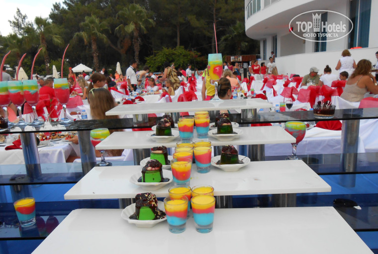 На обед и ужин лучше идти минут через 40-50 после начала, иначе можно не успеть занять столик, и простоять в очередях за едой. Еда однообразная. На горячее - кура. Раз в неделю можно увидеть -говядину. А один раз - куры нам не хватило, а говядины в тот день не было((( За мороженым очередь всегда. Дают его на пляже -утром, и у бассейна -вечером. Спиртное бесплатно до 24.00.