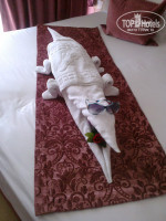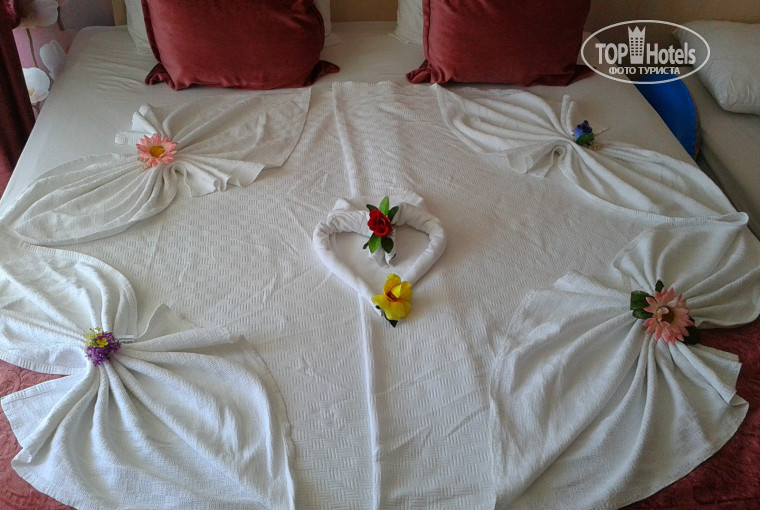 1)Размещение. Мы покупали путевку в ноябре(раннее бронирование). Ехали в Турцию второй раз. Когда около 9 ч утра приехали в отель, нам тут же предложили пройти позавтракать. Когда пришли с завтрака, нам вручили ключи, как оказалось от великолепного номера на 4 этаже с видом на бассейн и "кусочек" моря. Номер хоть и маленький, но очень уютный. В номере сдвинули две кровати и малому поставили удобную раскладушку. Все чисто, красиво, душ малюсенький, есть только жидкое мыло(шампунь и кусковое мыло мы привезли с собой), есть фен. Номер убирали каждый день, оставляли по 1 доллару каждый день - из простыней нам сворачивали настоящие произведения искусства. Мы брали сейф - 7 долларов за неделю, ценные вещи клали в него, но один раз ребенок играл и забыл под подушкой планшет Apple, ушли на море, возвращаемся, в номере убрано, на кроватях "зверюшки" из полотенец, а планшет спокойно лежит на столе. Ничего из личных вещей за неделю у нас не пропало.