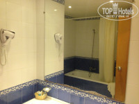 2. Номер (покупали sea view). Староватый ремонт, небольшая площадь. Розетки: чтобы заработала розетка на одном конце комнаты, нужно нажать выключатель на другом конце. Холодильник: не работал. Ванная: душ прикручен к середине ванной, раковина по часу смывает воду из крана (см. фото). Полотенца: выглядели довольно несвеже. Кондиционер: очень шумный, не охлаждает воздух. Вид из номера - см. фото. Sea вы можете view где-то там, на горизонте.