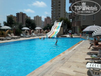 Территория отеля маленькая, газон и детская площадка. Один бассейн с детской горкой.