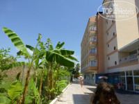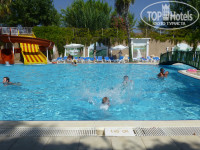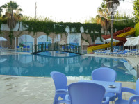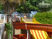 Территория вокруг отеля небольшая, мне понравилось, все близко, детей не потеряешь. Они сами гуляли. Бассейн сам делится на 2 зоны. Глубина бассейна везде 140см. Горки работали, напор воды был хороший. Дети и взрослые катались. Есть маленький бассейн для малышни. Рядом вроде бы напрокат давали разные плавательные матрасы, круги и т.д. Но мы не спрашивали, плавать все умеем.