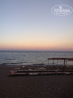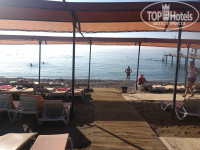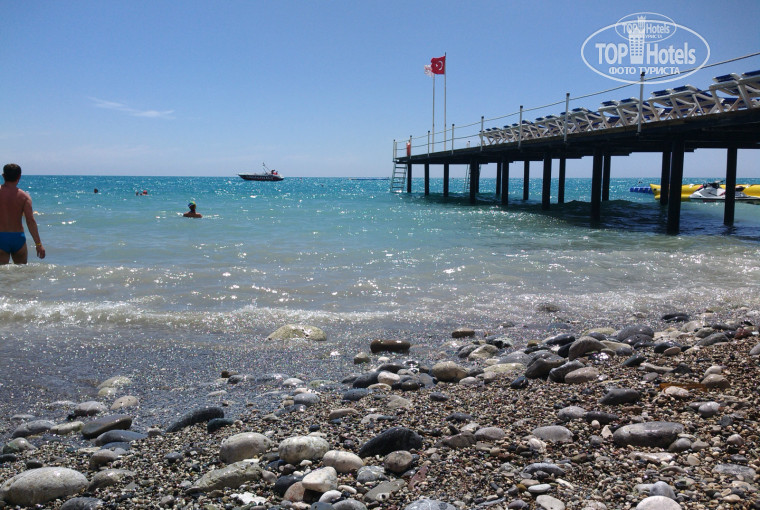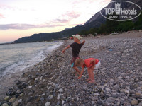 Пляж каменистый. У лежаков есть песок для детских игрищ. Вход в море трудный для тяжелых взрослых людей. У детей вес небольшой им идти по камням проще. Наши первые дня два ойкали что больно, а потом прекрасно босиком влетали в воду. Жена себе купила тапочки в ближайшей лавке за 4 уе.