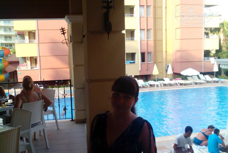 На самой территории три корпуса, три бассейна и одна горка, ресторан, два бара, магазин, хаммам,маленький салон красоты. Из напитков чай, кофе, сок из автомата, вода питьевая в куллерах, в нескольких местах. Можно было набрать в пустую бутылочку сколько хочешь и поехать на экскурсию, к примеру. Из алкоголя Раки, водка, джин, виски, пиво нормальное, вино белое (кислое) и красное (мне понравилось). Коктейль "Джин со спрайтом" тоже не плохой. Из еды: на завтрак омлет каждый день, в него можно самим добавить лук, помидоры, сыр (кто что хочет), отдельно колбасы (белая самая съедобная))), сыры, овощи, что то было из фруктов (сливы кислые, апельсины, арбузы), салаты, сладости, каша, хлопья, молоко. На обед и ужин картофель фри, лапша разных видов, рис вкусный, курица, наггетсы, рыба очень редко, котлеты были, сосиски двух видов. Вообщем голодными не были, объедались каждый раз....очень было страшно за фигуру)))
